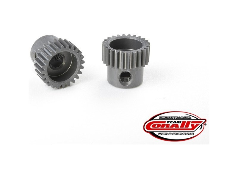 Pastorek Team Corally na hřídele elektromotorů nejen pro RC modely aut. Krátké provedení, materiál hliník AL7075-T6, 24 zubů, modul ozubení 64DP. Otvor pro hřídel o průměru 3.17 mm (1/8 in).