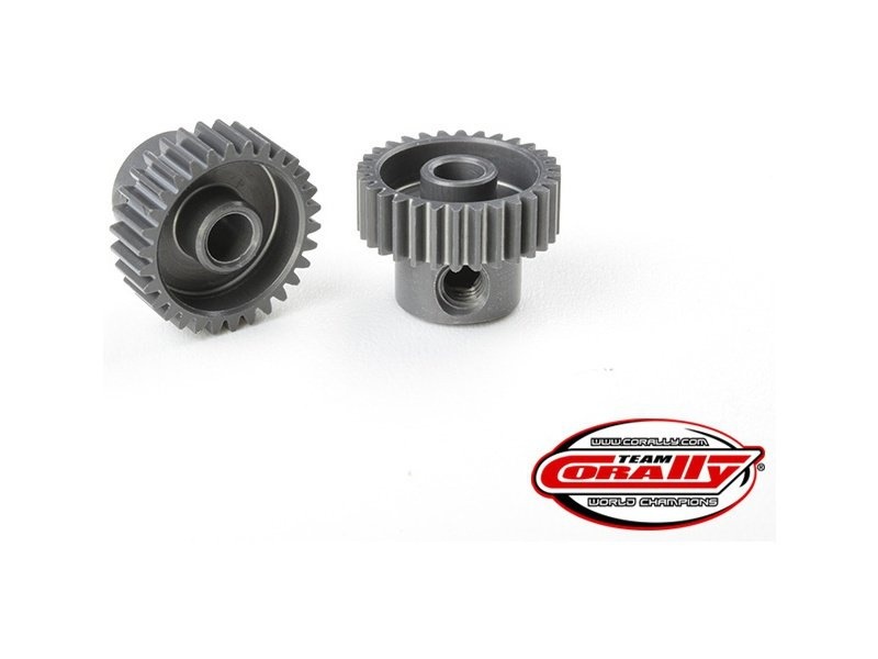 Pastorek Team Corally na hřídele elektromotorů nejen pro RC modely aut. Krátké provedení, materiál hliník AL7075-T6, 30 zubů, modul ozubení 64DP. Otvor pro hřídel o průměru 3.17 mm (1/8 in).