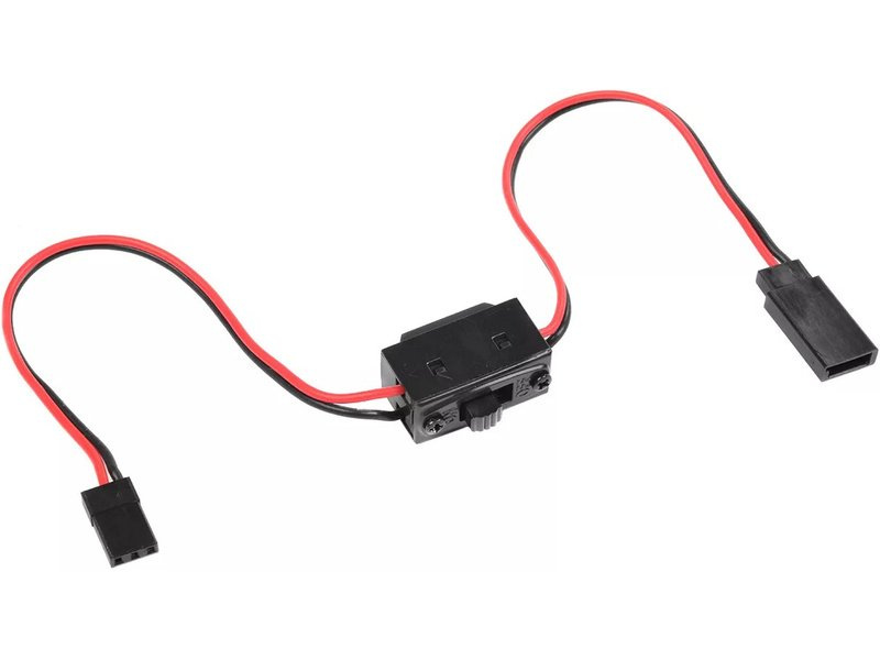 Posuvný vypínač s kabely 22AWG na obou stranách a RX konektory samec a samice typu JR. Více informací