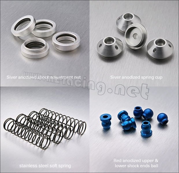Olejové tlumiče, vzdálenost středů ok 94mm, plynule nastavitelná tvrdost, průměr pružiny 19mm, délka pružiny 61mm, průměr tlumiče 14mm, průměr osy 3.5mm, rozsah 27mm, vč. lahvičky oleje a měkkých pružin, návod k sestavení,… Více informací