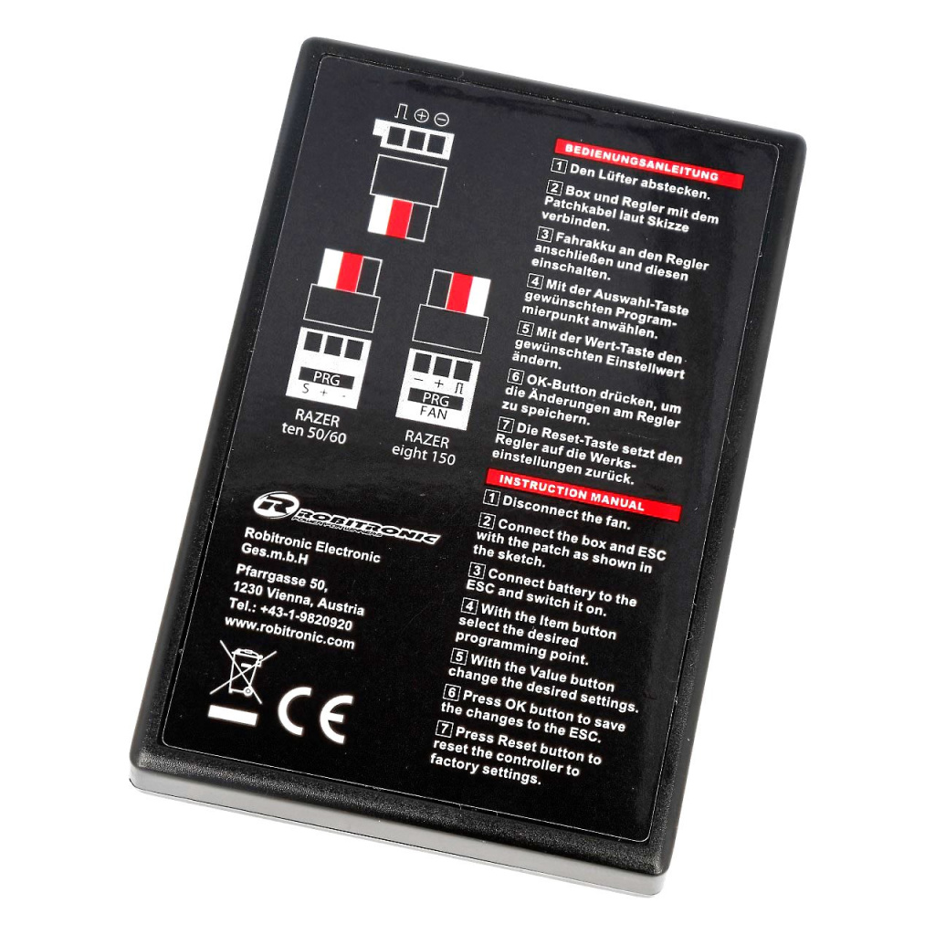 Programovací box ke střídavým regulátorům Robitronic Razer Ten. Výběr parametru a jeho příslušná hodnota se nastavují na segmentovém displeji z LED diod. Programátor se připojuje k regulátoru přes kabel, který jde do přijímače.