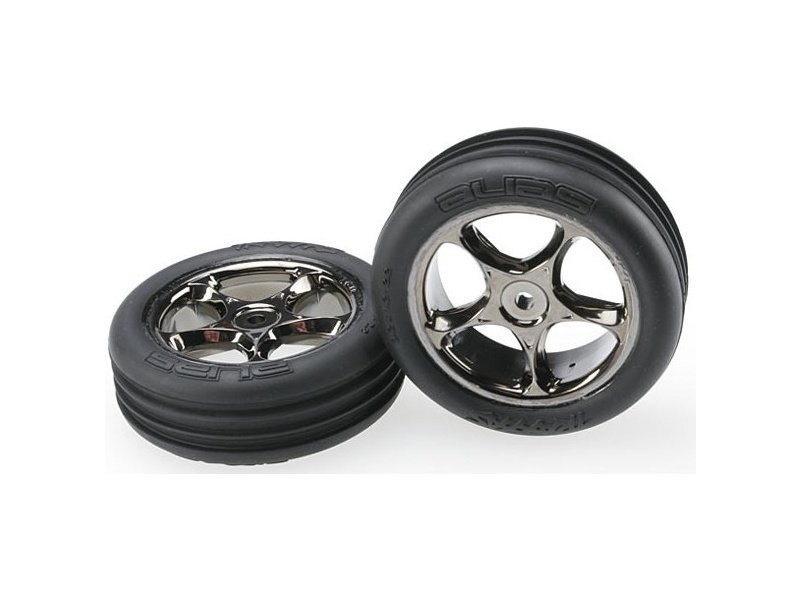 Kompletní přední kola pro auta Traxxas Bandit. Chromově černé disky s nalepenými měkkými pneumatikami Ribbed a vložkou. Rozměr disku ø56x24 mm (ø2.2"), celkový průměr 82 mm, celková šířka 27 mm.