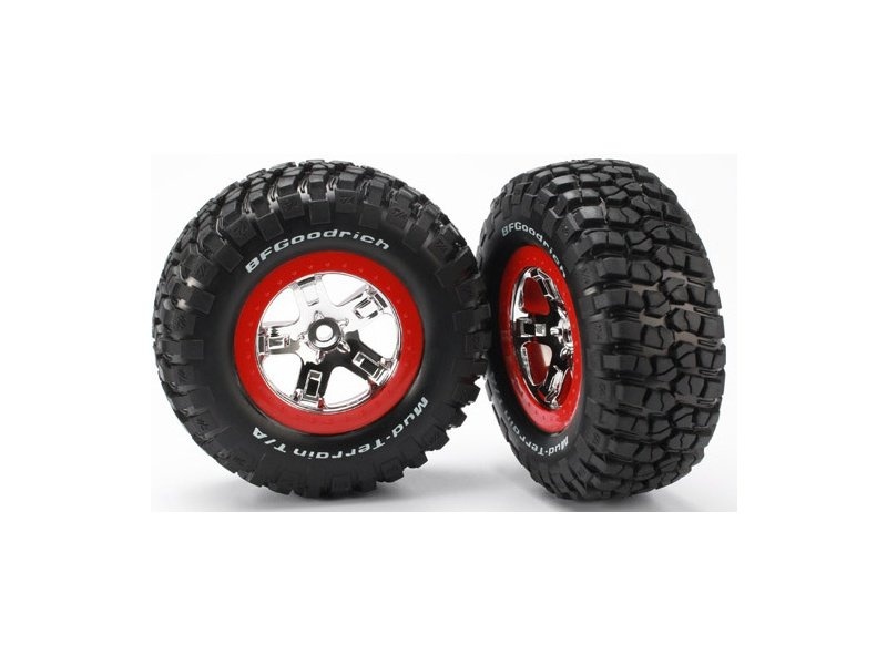 Kompletní zadní kola pro 2WD, přední i zadní pro 4WD auta Traxxas Slash. Červené disky s nalepenými pneumatikami BFGoodrich® a vložkou. Celkový průměr 110 mm, celková šířka 43 mm, šestihran 12 mm.
