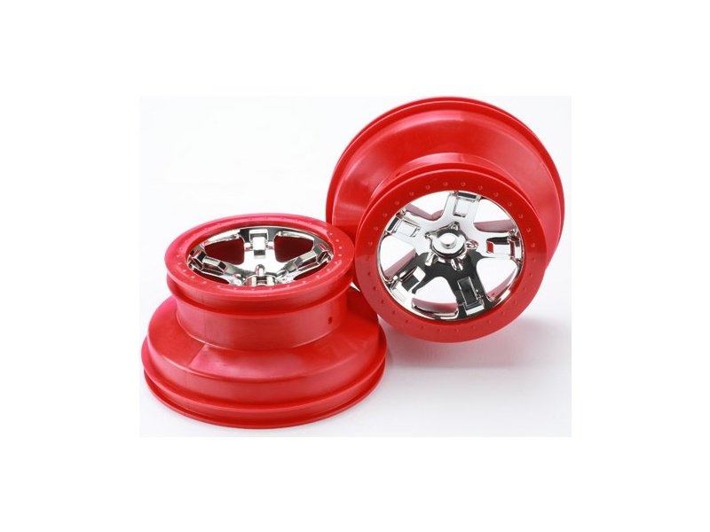 Disky kol 4WD přední/zadní, 2WD přední SCT chromově lesklé s červeným ráfkem. Průměr disku 56/76mm (2.2/3.0"), šířka 41mm. Pro auta Traxxas Slash. Šestihran 12mm.