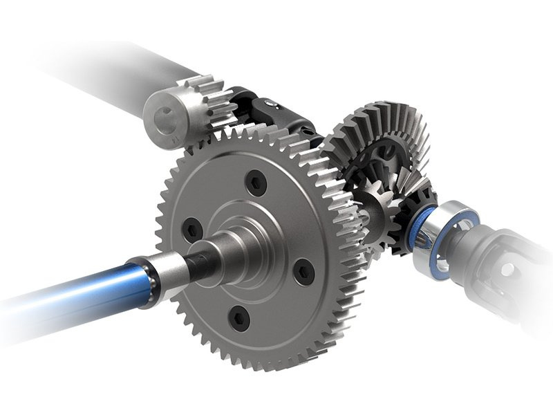 Extrémní výkon, vyžaduje maximálně odolné komponenty. Proto pohonné ústrojí tvoří ocelové čelní kolo, středový diferenciál pro distribuci výkonu mezi přední a zadní nápravu. Dále je točivý moment přenášen středovou hřídelí z extrudovaného hliníku k přednímu a zadnímu diferenciálu a následně ke kolům přes robustní teleskopické poloosy. Všechny rotační části jsou uloženy v kvalitních zapouzdřených ložiscích. Diferenciály jsou osazeny kovovými převody pro nejvyšší odolnost.