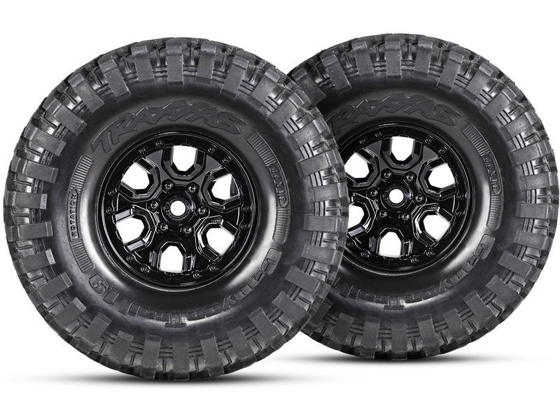 Pneumatiky Canyon Trail 1.9" z extra měkké směsi S1 jsou nalepeny na replice originálních kol Wildtrack. Unašeč kol má 12mm. RC model auta je rovněž vybaven plně funkčním rezervním kolem.